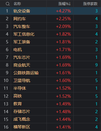 财联社8月1日电,市场全天震荡调整,创业板指领跌。盘面上,轨交、高铁概念股再度大涨,交大思诺、威奥股份、神州高铁、晋亿实业等涨停。商业航天概念股维持强势,春晖智控、航天晨光、航天长峰、星网宇达等涨停。芯片股午后冲高,士兰微、中晶科技均一度涨停。低空经济概念股尾盘拉升,上工申贝、宗申动力、王子新材涨停。网约车概念股继续活跃,通达电气、海马汽车、江西长运涨停。下跌方面,白酒股陷入调整,迎驾贡酒跌近5%。总体上个股跌多涨少,全市场超2800只个股下跌。沪深两市今日成交额7823亿,较上个交易日缩量1210亿。板块方面,轨交设备、网约车、商业航天、半导体等板块涨幅居前,白酒、家电、零售、煤炭等板块跌幅居前。截至收盘,沪指跌0.22%,深成指跌0.92%,创业板指跌1.31%。