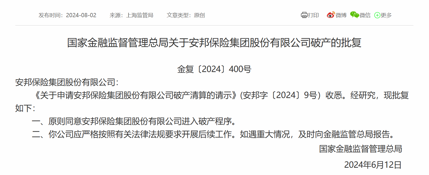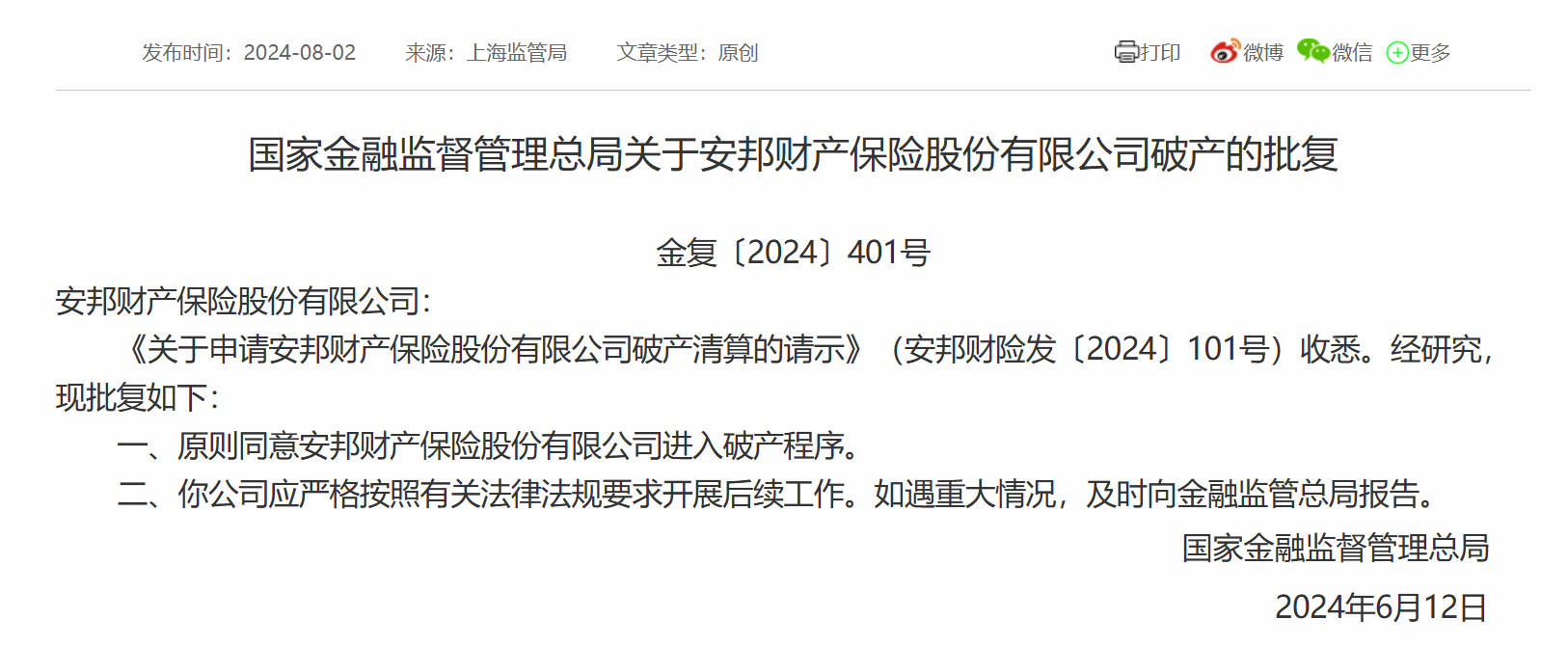 财联社8月2日电,国家金融监督管理总局近期发布批复显示,同意安邦保险集团股份有限公司和安邦财产保险股份有限公司进入破产程序。