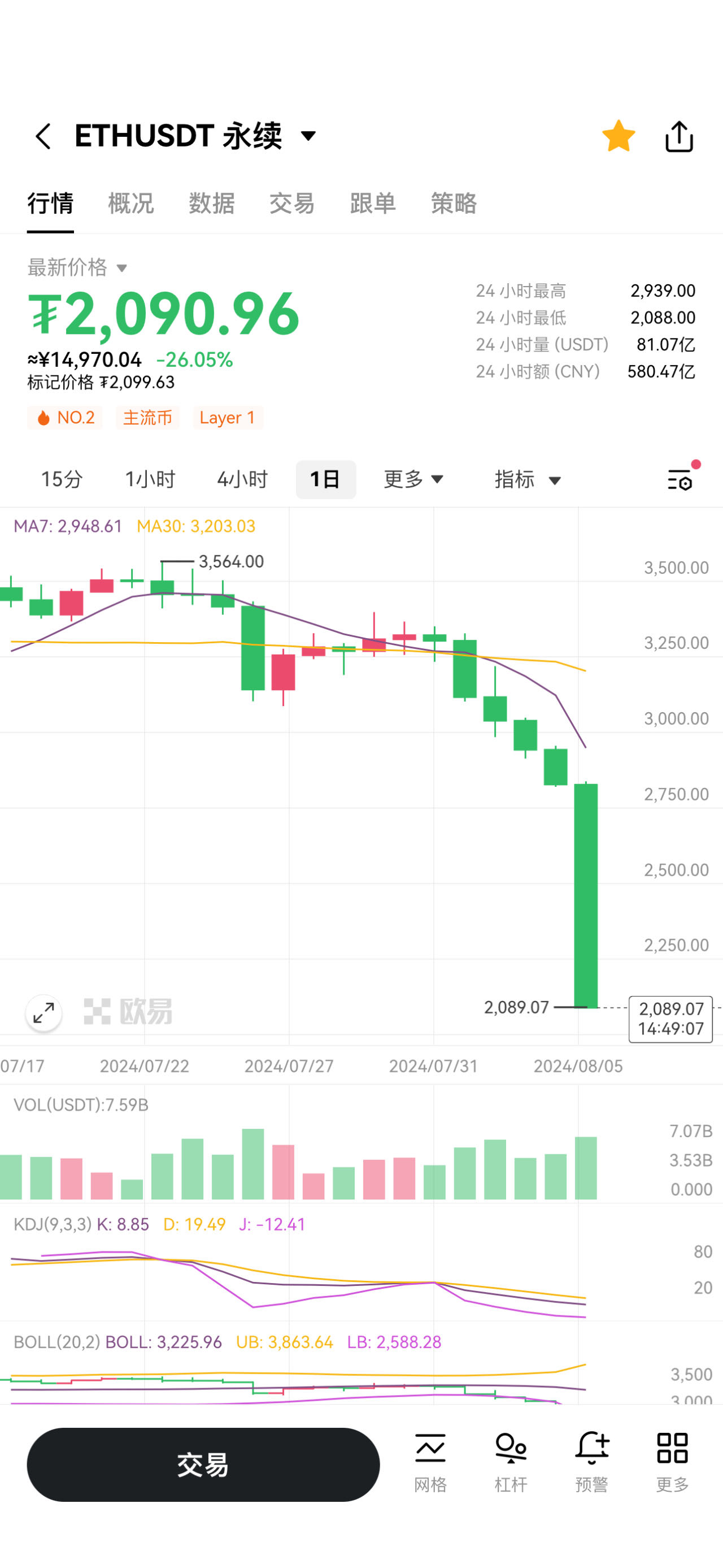 以太坊跌破2100美元 日内跌幅超26%
