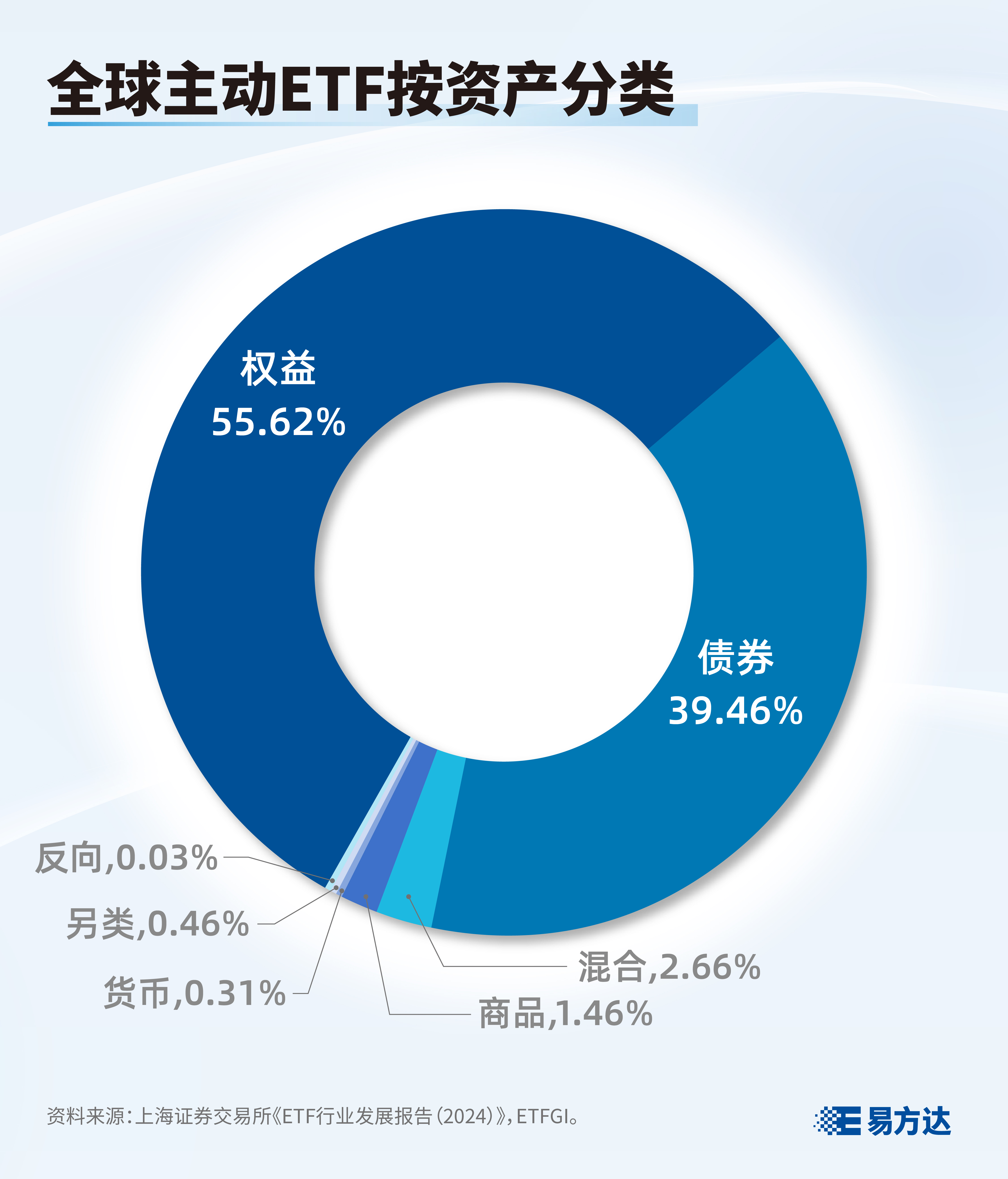 顾名思义,就像普通基金的分类一样,权益型的主动ETF主要投资于股票,债券型的主动ETF主要投资于债券,以此类推。目前,全球主动ETF以权益型和债券型为主,权益型占比超五成,债券型占比近四成。
