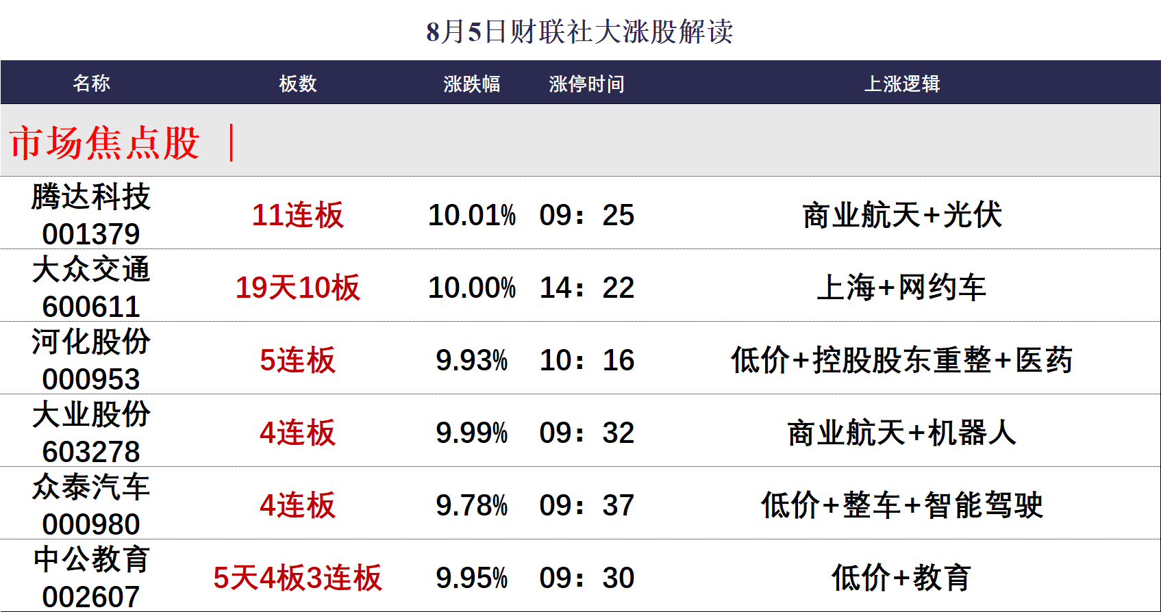 今日共46股涨停,连板股总数14只,22股封板未遂,封板率为68%(不含ST股、退市股及未开板新股)。焦点股方面,腾达科技11连板打开市场高度空间,人气股大众交通录得19天10板,低价股持续走强,河化股份5连板、众泰汽车4连板、中公教育5天4板。