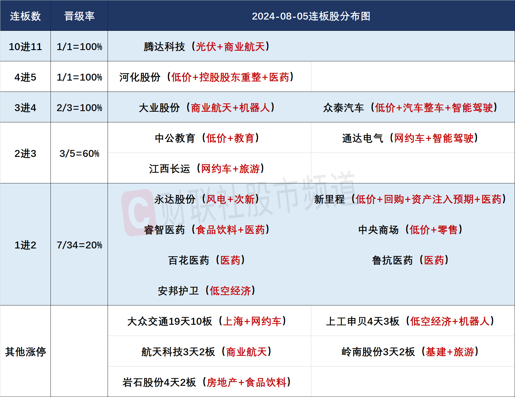 今日共46股涨停,连板股总数14只,其中三连板及以上个股7只,上一交易日共13只连板股,连板股晋级率53.84%(不含ST股、退市股及未开板新股)。个股方面,全市场超4700只个股下跌,低价股继续走强,今日46只涨停股中有35只股价不足10元,低价股中涌现出一批如众泰汽车、中公教育、河化股份的强势连板股。高位人气股进入“淘汰赛阶段”,人气最强的腾达科技11连板,大众交通19天10板,而启明信息、山子高科则尾盘跌停,此外江铃汽车二连跌停,表明连板风格的赚钱难度激增。板块方面,教育、旅游、白酒等大消费板块早盘走强,消息面上,国务院日前印发《关于促进服务消费高质量发展的意见》,提出6方面20项重点任务;算力、消费电子、资源等受外围影响较大的板块领跌,中际旭创、工业富联、立讯精密等权重跌超7%,中石油、中海油双双跌近5%。