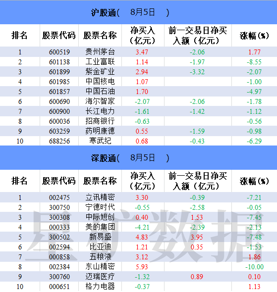 财联社8月5日电,北向资金今日净买入2.88亿元。东山精密、新易盛、贵州茅台分别获净买入5.93亿元、4.83亿元、3.47亿元。美的集团净卖出额居首,金额为4.21亿元。