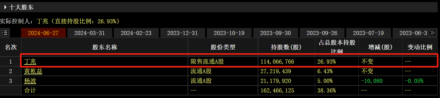 公开资料显示,董事长丁兆为汇宇制药控股股东、实际控制人,也是公司第一大股东。截至6月27日,丁兆持有1.14亿股汇宇制药,持股比例26.93%。二级市场方面,汇宇制药2023年8月23日至2023年9月27日期间股价累计最大涨幅仅达11.61%。