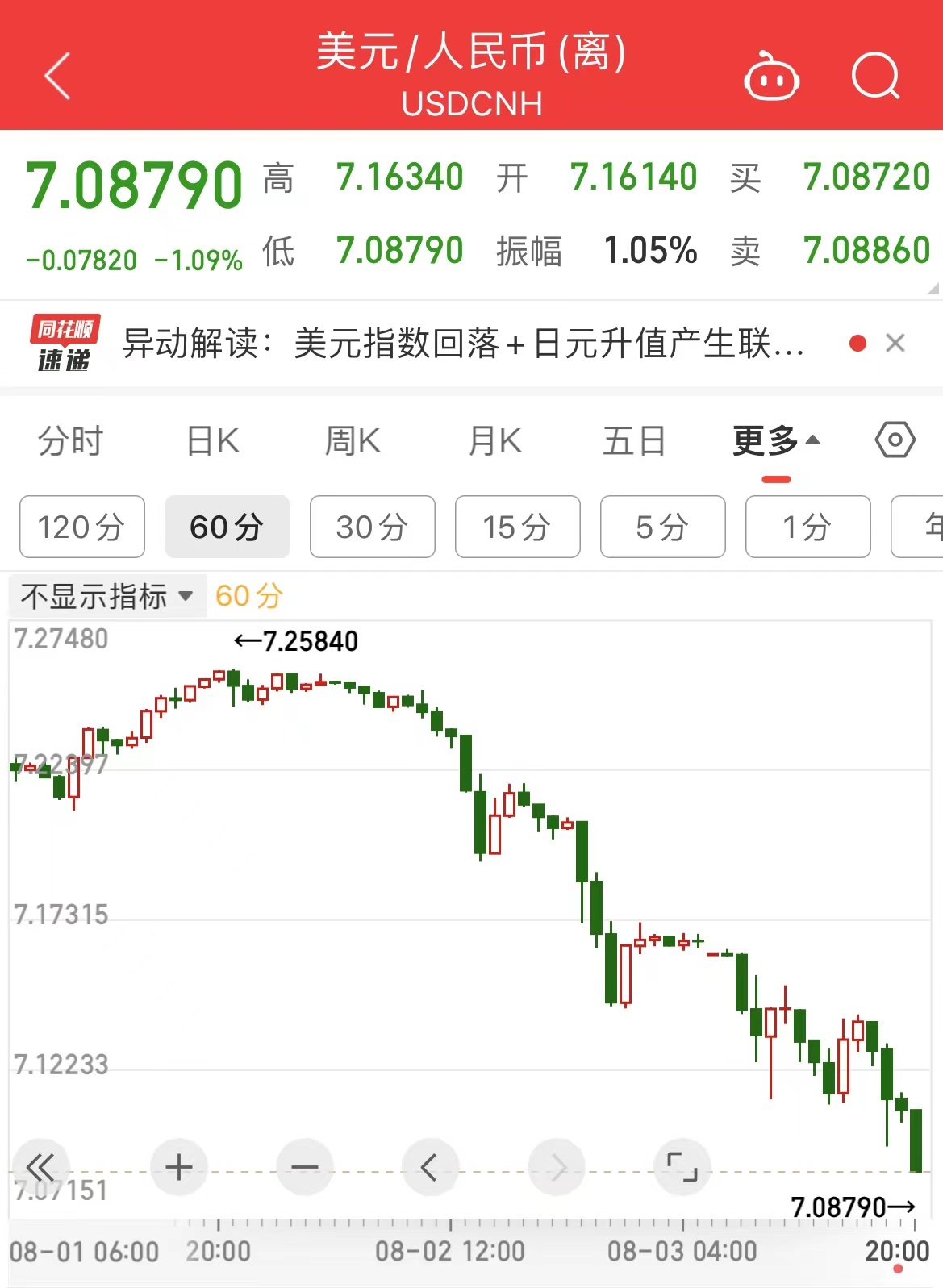 财联社8月5日电,离岸人民币兑美元升穿7.09,日内大涨超700点。