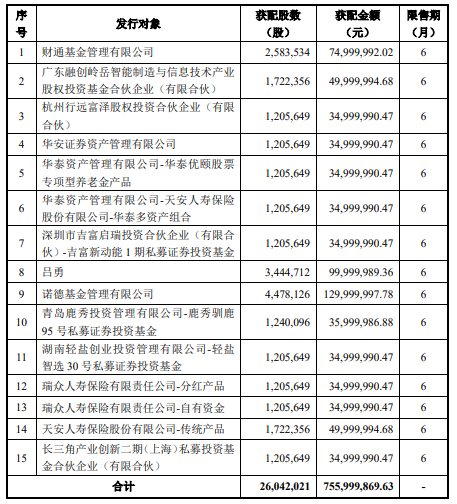 财联社8月5日电,恒铭达公布向特定对象发行股票发行情况报告书,本次实际发行股票数量为26,042,021股,募集资金总额约为7.56亿元,本次发行价格为29.03元/股。本次发行的具体配售结果如下。