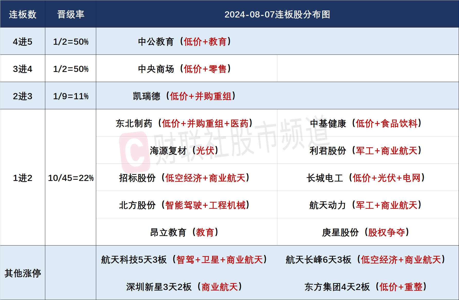 今日共49股涨停,连板股总数13只,其中三连板及以上个股3只,上一交易日共14只连板股,连板股晋级率21.42%(不含ST股、退市股及未开板新股)。个股方面,短线情绪进一步走弱,高度板(昨6连板)河化股份竞价跌停,昨4连板通达电气跌停,昨3连板永达股份跌停,人气股腾达科技跌超8%,虽然今日仍有13只连板股,但三连板及以上个股数量仅3只。板块方面,商业航天概念股表现活跃,“航天系”领涨,航天科技5天3板、航天长峰6天3板、航天动力2连板,消息面上,工信部有序推进卫星互联网业务准入制度改革;光缆光纤板块全线大涨,汇源通信、通鼎互联、长飞光纤等个股涨停,美股光纤股Lumen Technologies爆涨93%,其表示由于人工智能推动了对连接的主要需求,该公司已经获得了50亿美元的新业务。