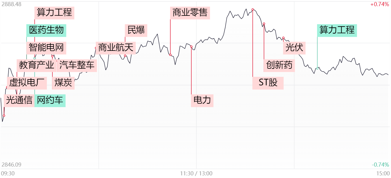 财联社8月8日电,市场全天震荡分化,沪指相对偏强。总体上个股跌多涨少,全市场超2800只个股下跌。沪深两市成交额5920亿,较前日缩量622亿,再度跌破6000亿。1)随着千帆星座发射的消息短期落地,在政策面消息助攻下,使得商业航天概念内部良性高低切换延续,腾达科技盘中再度触及跌停,而航天科技反包涨停,加上招标股份晋级2连板,带动天银机电、乾照光电、航天长峰等多股涨停。2)国家发改委等三部门印发《加快构建新型电力系统行动方案(2024—2027年)》,提出建设一批虚拟电厂,加上7月末以来全国多地连续出现极端高温天气,刺激电网、电力产业链集体爆发,积成电子、尚纬股份、长城电工、郴电国际、明星电力等多股涨停。3)美股光纤股Lumen Technologies宣布,由于人工智能推动了对连接的主要需求,该公司已经获得了50亿美元的新业务,受此消息刺激,该股飙升93%,进而带动光通信概念集体爆发,通光线缆、长飞光纤、汇源通信、永鼎股份等多只光纤股涨停。4)国务院近日印发《关于促进服务消费高质量发展的意见》,提出激发教育和培训消费活力。教育板块在此前连续反弹后展开分歧,不过前排个股仍然维持高热度,中公教育和昂立教育两只连板股双双实现晋级,科德教育、博通股份、全通教育等盘中一度大幅冲高。
