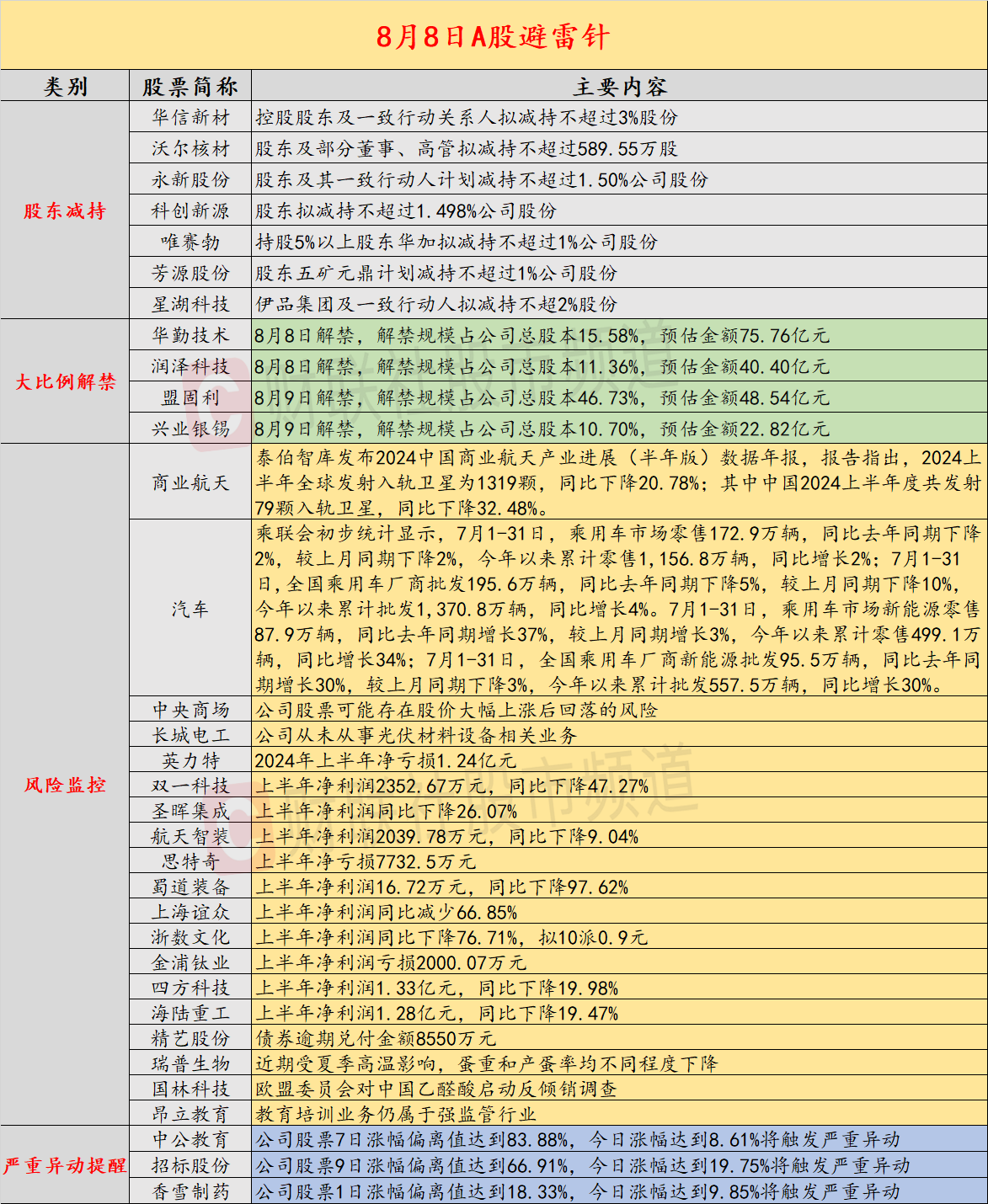 昨日公告的A股拟减持的公司数量较之前有所增多,华信新材控股股东及一致行动关系人拟减持不超过3%股份;盟固利将迎来超四成以上解禁;涉嫌在国债二级市场交易中操纵市场价格、利益输送,交易商协会对4家农村商业银行启动自律调查;4连板中央商场公告,公司股票可能存在股价大幅上涨后回落的风险;中国2024上半年度共发射79颗入轨卫星,同比下降32.48%;2连板长城电工表示,公司从未从事光伏材料设备相关业务;美股三大指数高开低走集体收跌,英伟达跌超5%。