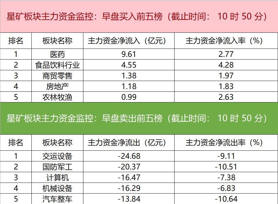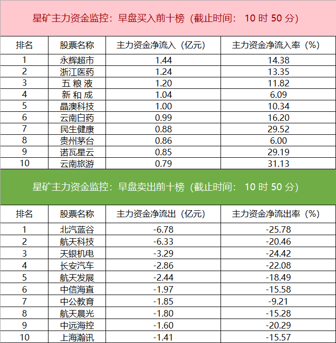 财联社8月8日电,财联社星矿数据显示,今日早盘主力资金净流入医药、食品饮料行业、商贸零售等板块,净流出交运设备、国防军工、计算机等板块,其中交运设备板块净流出超24亿元。个股方面,永辉超市涨停,主力资金净买入1.44亿元位居首位,浙江医药、五粮液、新和成获主力资金净流入居前;北汽蓝谷遭净卖出超6亿元,航天科技、天银机电、长安汽车主力资金净流出额居前。