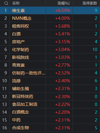 财联社8月8日电,市场早盘探底回升,三大指数小幅上涨。盘面上,大消费股集体走强,其中白酒股领涨,皇台酒业、岩石股份涨停;影视股盘中拉升,唐德影视20CM涨停;零售股持续活跃,中央商场、永辉超市涨停。维生素概念股开盘大涨,东北制药、广济药业、圣达生物、浙江医药等涨停。地产股震荡走高。金地集团、世联行、深物业A涨停。下跌方面,高位股持续调整,教育、商业航天等方向领跌,昂立教育跌停,飞沃科技跌超10%。总体上个股涨多跌少,全市场超3000只个股上涨。沪深两市半日成交额4253亿,与上个交易日放量521亿。板块方面,维生素、白酒、影视、食品等板块涨幅居前,教育、商业航天、网约车、贵金属等板块跌幅居前。截至收盘,沪指涨0.38%,深成指涨0.49%,创业板指涨0.09%。