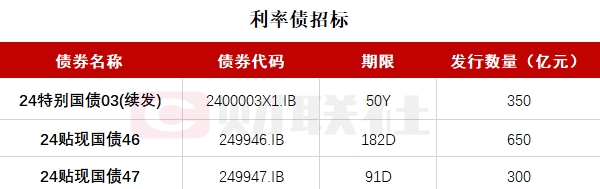财联社8月9日电,按照此前公布的发行计划,财政部将于上午10:35-11:35招标发行三期国债,分别为: 24贴现国债47 ,期限91天,发行量300亿;24特别国债03(续发),期限50Y,发行量350亿,票面利率2.53%;24贴现国债46,期限182天,发行量650亿。
