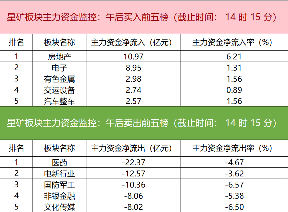 财联社8月9日电,财联社星矿数据显示,今日主力资金净流入房地产、电子、有色金属等板块,净流出医药、电新行业、国防军工等板块,其中医药板块净流出22.37亿元。个股方面,金龙汽车大涨,主力资金净买入4.21亿元居首位,万科A、金地集团、四维图新获主力资金净流入居前;大众交通遭净卖出2.35亿元居净流出首位,永泰能源、盟固利、乾照光电等主力资金净流出额居前。