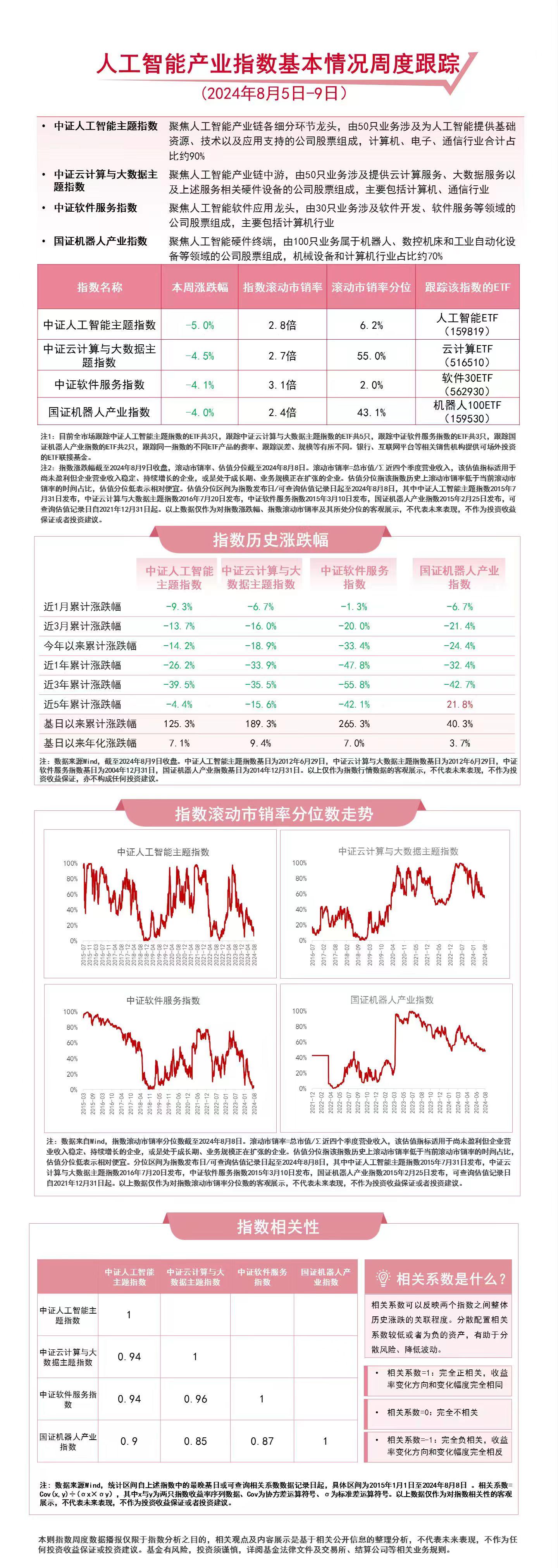 财联社8月10日电,本周国证机器人产业指数下跌4.0%,中证软件服务指数下跌4.1%,中证云计算与大数据主题指数下跌4.5%,中证人工智能主题指数下跌5.0%。