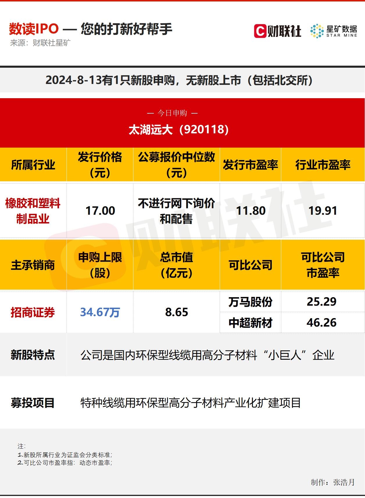 财联社8月13日电,今日有1只新股申购,为北交所的太湖远大;无新股上市。太湖远大是国内环保型线缆用高分子材料“小巨人”企业。