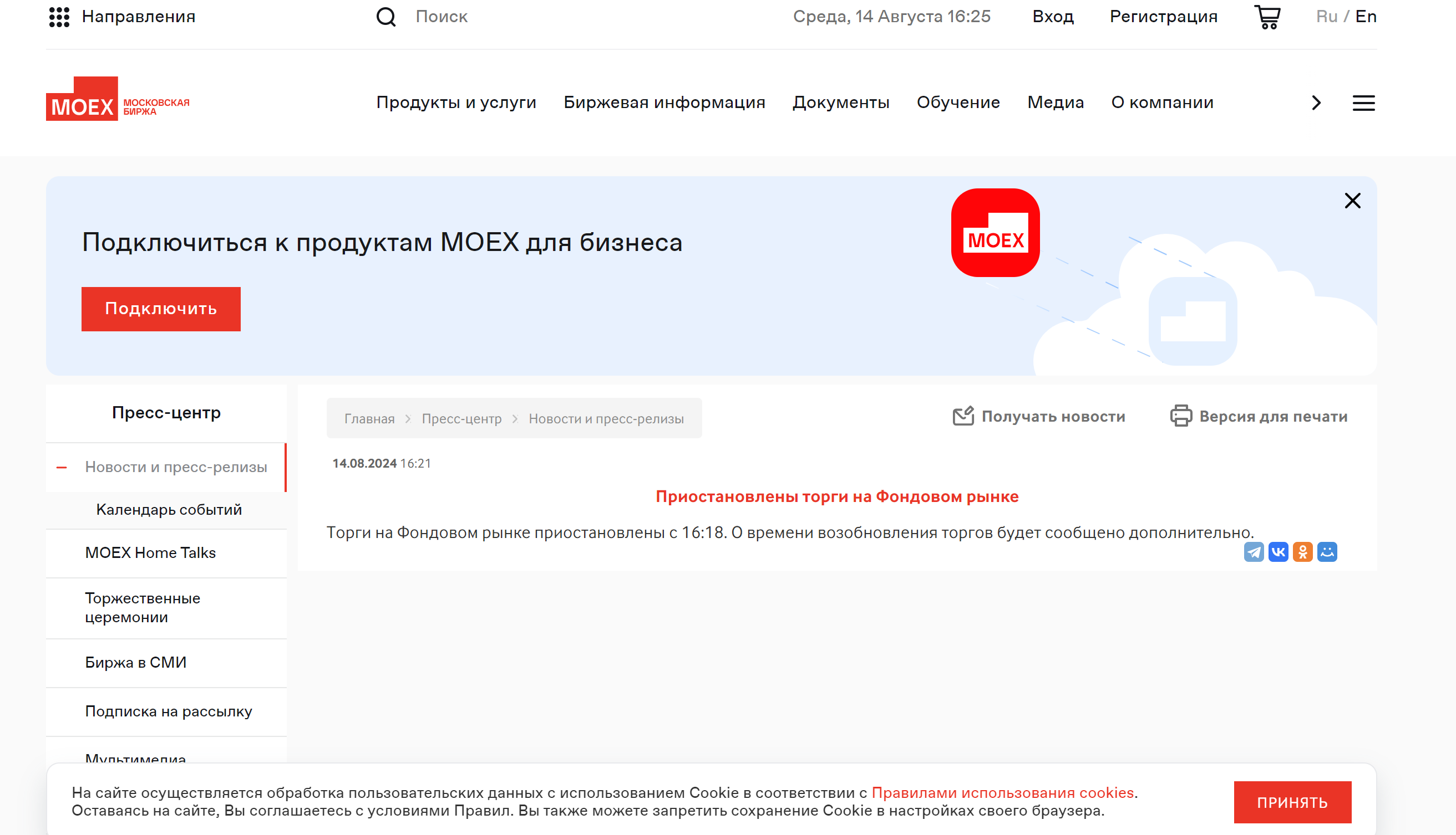当地时间8月14日16时18分,俄罗斯莫斯科交易所股票暂停交易,原因暂时不明。