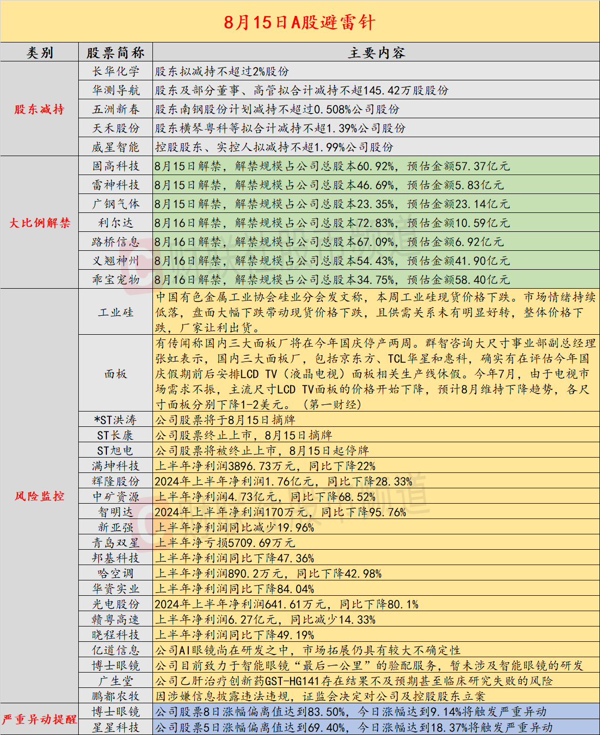 昨日公告的A股拟减持的公司数量较之前有所减少,长华化学股东拟减持不超过2%股份;雷神科技、固高科技将迎来超四成以上解禁;硅业分会发文称,本周工业硅盘面大幅下跌,市场情绪低落;*ST洪涛公司股票将于8月15日摘牌;年内已有36只发起式基金清盘;ST长康公司股票终止上市,8月15日摘牌;热门中概股普跌,纳斯达克中国金龙指数跌超1%。
