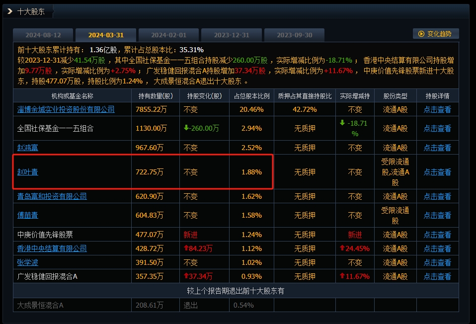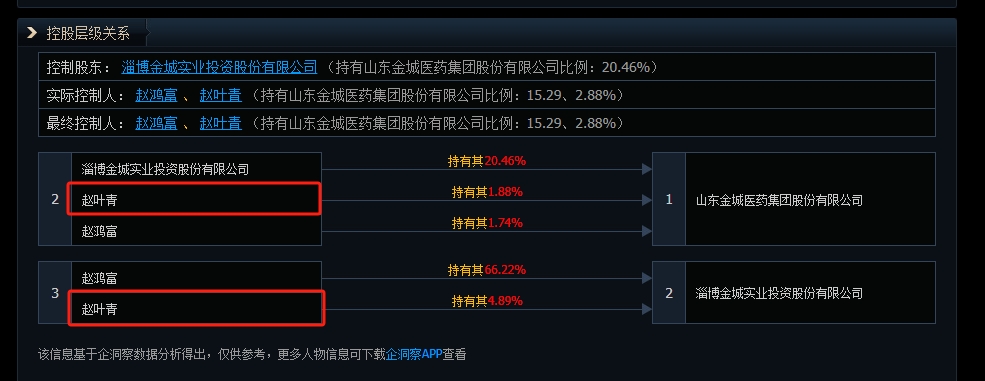 小财注:数据显示,截至一季度末,淄博金城实业投资股份有限公司持股比例为20.46%,位列金城医药十大股东之首。赵鸿富与赵叶青父子二人分别持有淄博金城实业投资股份有限公司66.22%、4.89%股份,系金城医药实际控制人。赵叶青直接持有金城医药1.88%股份,位列第四大股东。