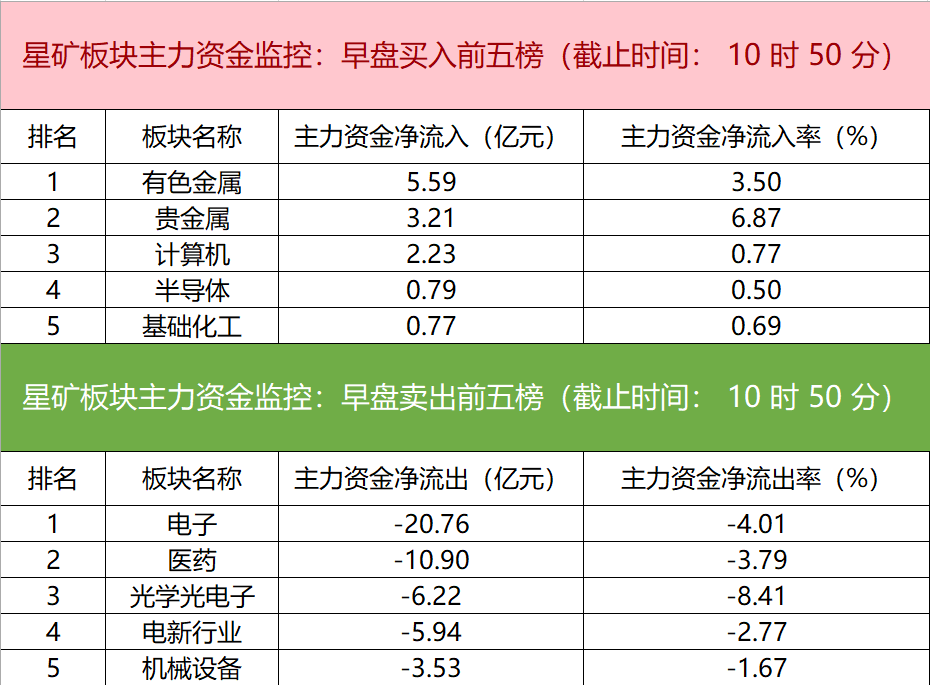 财联社8月19日电,财联社星矿数据显示,今日早盘主力资金净流入有色金属、贵金属、计算机等板块,净流出电子、医药、光学光电子等板块,其中电子板块净流出超20亿元。个股方面,华谊兄弟一度涨停,主力资金净买入1.62亿元位居首位,中际旭创、寒武纪、华峰超纤获主力资金净流入居前;力源信息遭净卖出超4亿元,世纪鼎利、北汽蓝谷、长安汽车主力资金净流出额居前。