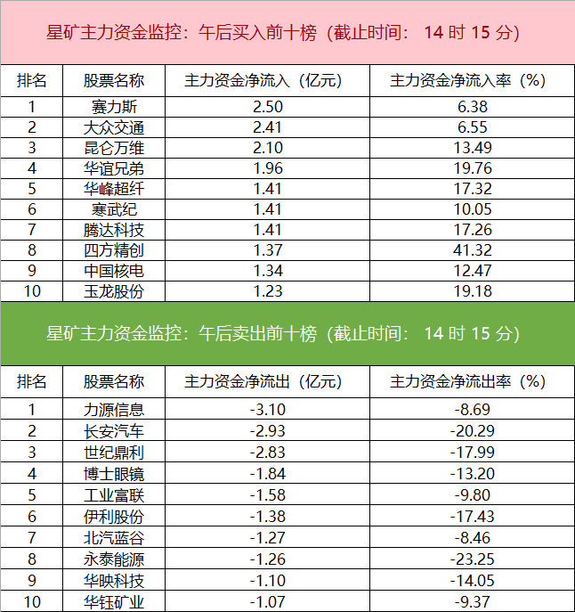 主力资金监控:赛力斯净买入超2亿
