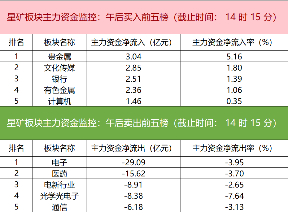 财联社8月19日电,财联社星矿数据显示,今日主力资金净流入贵金属、文化传媒、银行等板块,净流出电子、医药、电新行业等板块,其中电子板块净流出29.09亿元。个股方面,赛力斯上涨,主力资金净买入2.50亿元居首位,大众交通、昆仑万维、华谊兄弟获主力资金净流入居前;力源信息遭净卖出3.10亿元居净流出首位,长安汽车、世纪鼎利、博士眼镜等主力资金净流出额居前。
