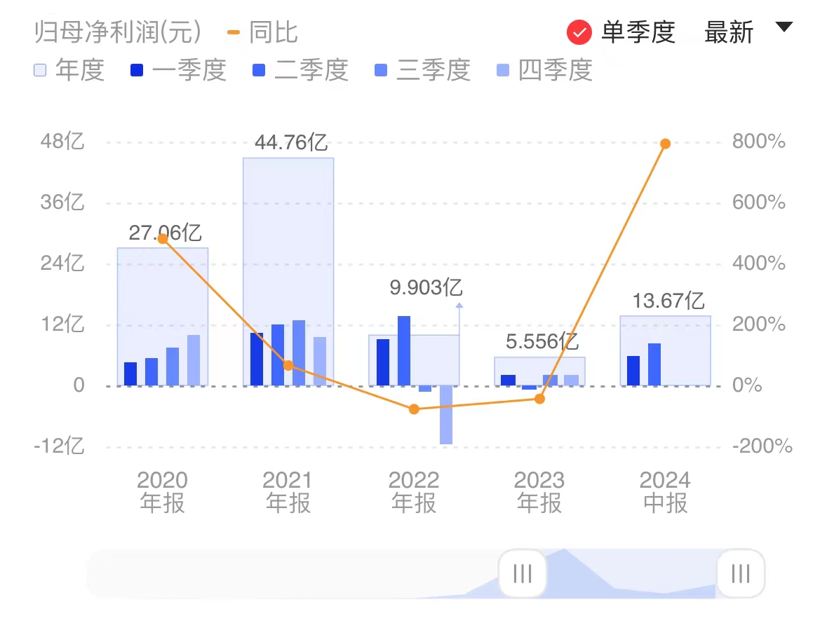财联社8月19日电,韦尔股份发布2024年半年度报告,公司上半年实现营业收入120.91亿元,同比增长36.50%;归属于上市公司股东的净利润为13.67亿元,同比增长792.79%;基本每股收益1.14元。小财注:Q1净利5.58亿元,据此计算,Q2净利8.09亿元,环比增长45%。