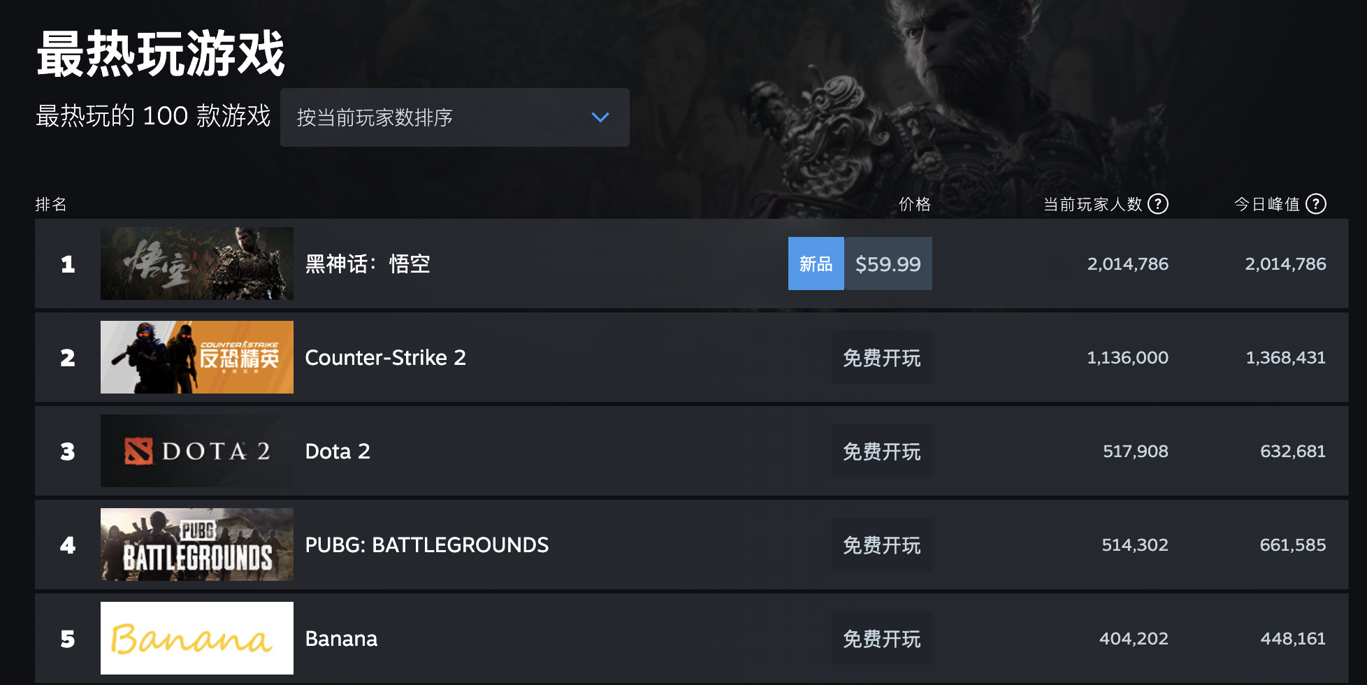 国产游戏《黑神话:悟空》Steam在线人数峰值突破200万