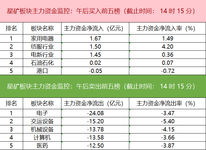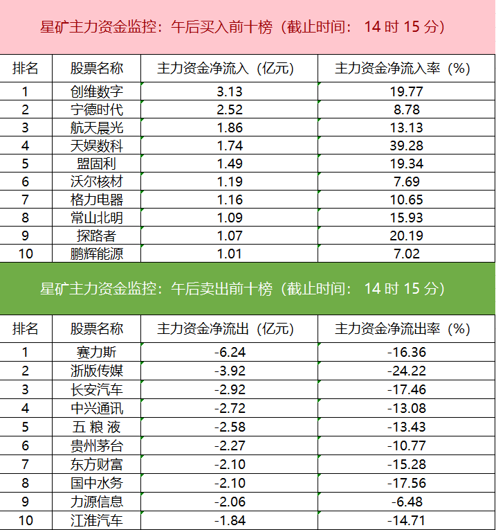 财联社8月22日电,财联社星矿数据显示,今日主力资金净流入家用电器、纺服行业、电新等板块,净流出电子、交运设备、机械设备等板块,其中电子板块净流出24.08亿元。个股方面,创维数字主力资金净流入3.13亿元居首位,宁德时代、航天晨光、天娱数科获主力资金净流入居前;赛力斯遭净卖出6.24亿元居净流出首位,浙版传媒、长安汽车、中兴通讯等主力资金净流出额居前。