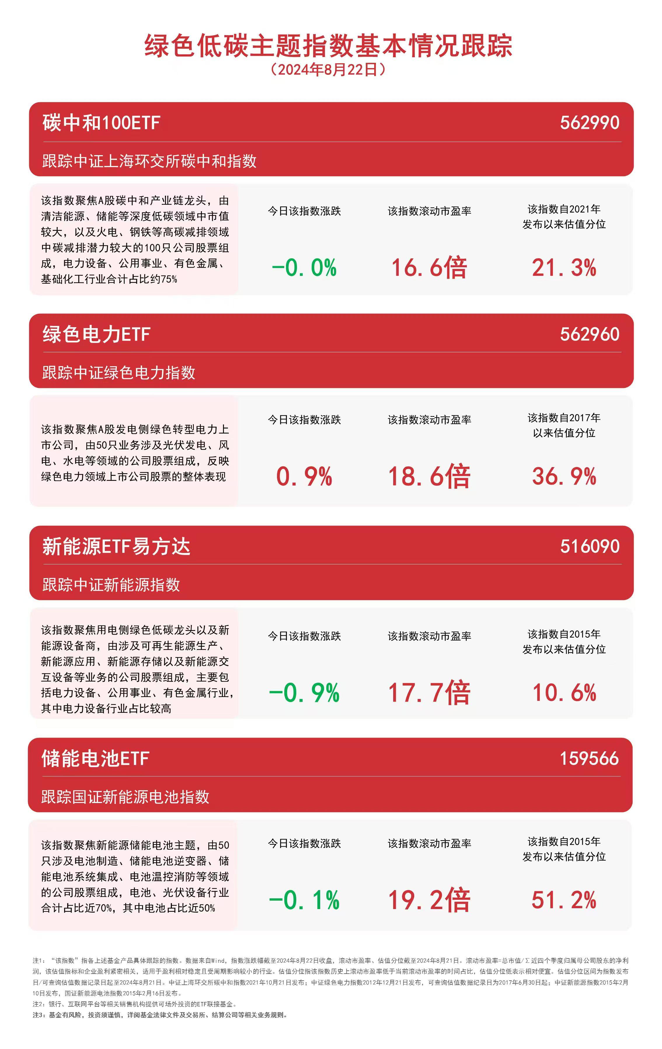 财联社8月22日电,截至收盘,今日中证绿色电力指数上涨0.9%,中证上海环交所碳中和指数下跌0.04%,国证新能源电池指数下跌0.1%,中证新能源指数下跌0.9%。
