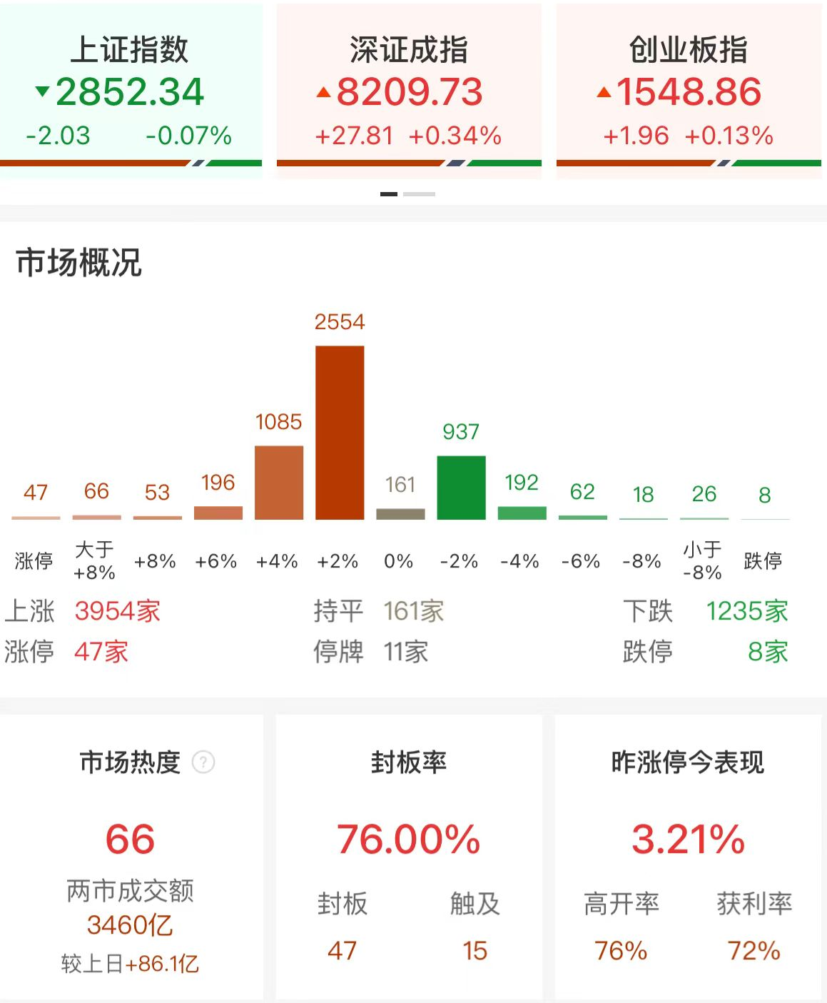 财联社8月26日电,市场早盘震荡分化,三大指数涨跌不一。指数黄白分时线明显分化,题材股较活跃。盘面上,固态电池概念股再度走强,东方锆业、三祥新材、传艺科技、鹿山新材等10股涨停。折叠屏概念股盘中拉升,金太阳、精研科技、道明光学、科森科技等涨停。西部大开发概念股继续活跃,西部建设、新疆交建、国统股份等涨停。房屋检测概念股开盘大涨,建科股份、国检集团、上海建科等涨停。下跌方面,高速公路概念股集体调整,深高速跌停。总体上个股涨多跌少,全市场超3900只个股上涨。沪深两市半日成交额3460亿,与上个交易日放量86亿。板块方面,固态电池、柔性屏、新疆、建筑节能等板块涨幅居前,教育、高速公路、白酒、猴痘等板块跌幅居前。截至收盘,沪指跌0.07%,深成指涨0.34%,创业板指涨0.13%。
