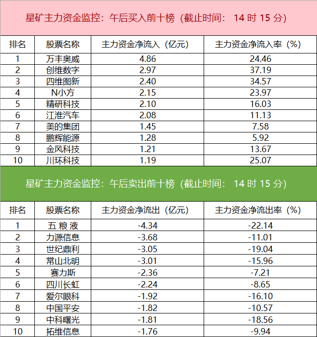 财联社8月26日电,财联社星矿数据显示,今日主力资金净流入家用电器、小金属、石油石化等板块,净流出计算机、食品饮料、通信等板块,其中计算机板块净流出17.08亿元。个股方面,万丰奥威涨停,主力资金净流入4.86亿元居首位,创维数字、四维图新、N小方获主力资金净流入居前;五粮液遭净卖出4.34亿元居净流出首位,力源信息、世纪鼎利、常山北明等主力资金净流出额居前。