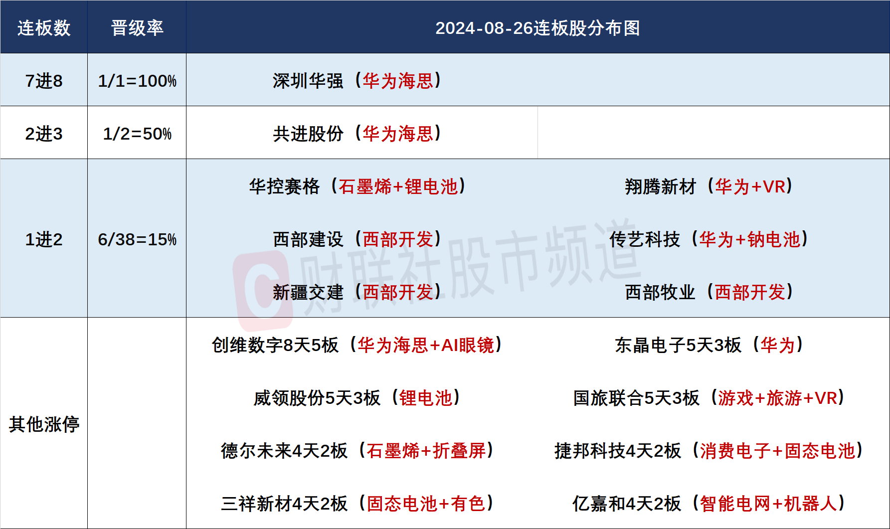 今日共44股涨停,连板股总数8只,上一交易日共41只个股涨停,涨停股晋级率19.51%(不含ST股、退市股及未开板新股)。个股方面,短线行情有所回暖,深圳华强一字涨停晋级8连板,继续向上打开高度空间,国旅联合、德尔未来等一批个股向上涨停反包。中报披露即将收官,部分业绩低于预期的白马股跌幅居前,中国中车、时代电气跌超5%,深高速、海信视像跌停。板块方面,固态电池、华为海思、西部开发、折叠屏、房屋检测、AI眼镜等一批题材轮动上涨。房屋检测概念率先走强,国检集团、上海建科一字涨停,消息面上住建部副部长董建国近日表示,研究建立房屋体检、房屋养老金、房屋保险这三项制度;固态电池板块得到资金回流,三祥新材、捷邦科技4天2板,中信证券研报表示,固态电池因高安全和高能量密度,有望开启新一轮电动化创新周期。