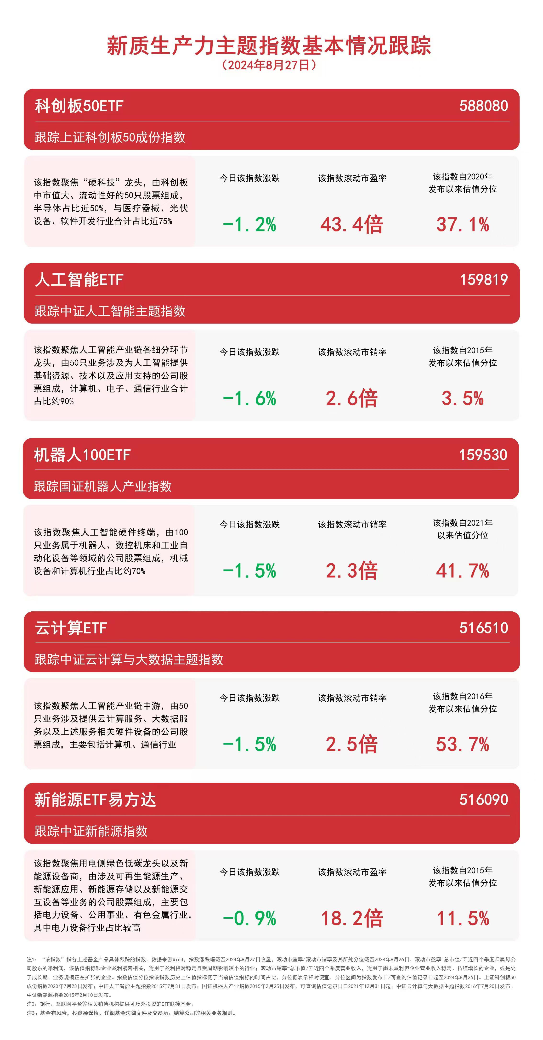 财联社8月27日电,截至收盘,今日中证新能源指数下跌0.9%,上证科创板50成份指数下跌1.2%,国证机器人产业指数下跌1.5%,中证云计算与大数据主题指数下跌1.5%,中证人工智能主题指数下跌1.6%。
