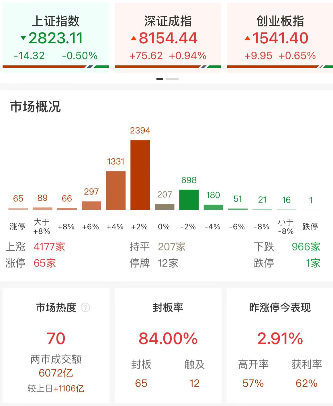 财联社8月29日电,市场全天震荡分化,深成指、创业板指反弹,沪指调整。盘面上,折叠屏概念股再度爆发,智动力、爱司凯、科森科技、领益智造等10余股涨停。光伏概念股集体反弹,快可电子、宝馨科技、钧达股份、伊戈尔等涨停。机器人概念股盘中活跃,禾川科技涨超10%,亿嘉和涨停。白酒股迎来反弹,老白干酒涨停。下跌方面,银行股集体调整,农业银行、建设银行跌超4%。总体上个股涨多跌少,全市场超4100只个股上涨。沪深两市今日成交额6072亿,较上个交易日放量1106亿。板块方面,光伏设备、折叠屏、人形机器人、牙科医疗等板块涨幅居前,银行、房屋检测、高速公路、免税等板块跌幅居前。截至收盘,沪指跌0.5%,深成指涨0.94%,创业板指涨0.65%。