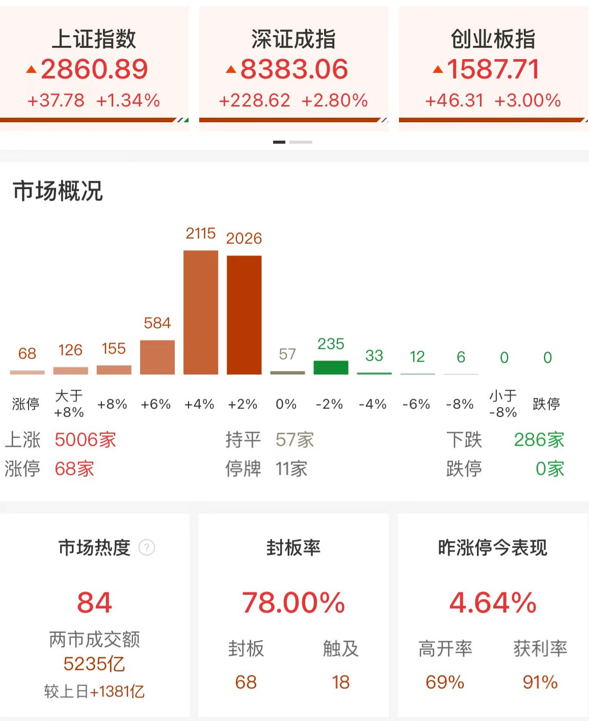 财联社8月30日电,市场早盘集体反弹,创业板指领涨。盘面上,消费电子概念股持续大涨,折叠屏、华为海思、AI眼镜等多个方向表现活跃,智动力、科森科技、日久光电、维信诺等近20股涨停。半导体板块展开反弹,光刻机方向领涨,国林科技、华亚智能、东方嘉盛涨停。券商、保险股震荡走强,中国银河、华鑫股份、天茂集团涨停。医疗器械概念股盘中拉升,乐心医疗5天4板,迈瑞医疗涨近10%。下跌方面,红利股一度下挫,交通银行跌超3%。总体上个股涨多跌少,全市场超5000只个上涨。沪深两市半日成交额5235亿,与上个交易日放量1380亿。板块方面,华为海思、光刻机、保险、折叠屏等板块涨幅居前,无下跌板块。截至收盘,沪指涨1.34%,深成指涨2.8%,创业板指涨3%。