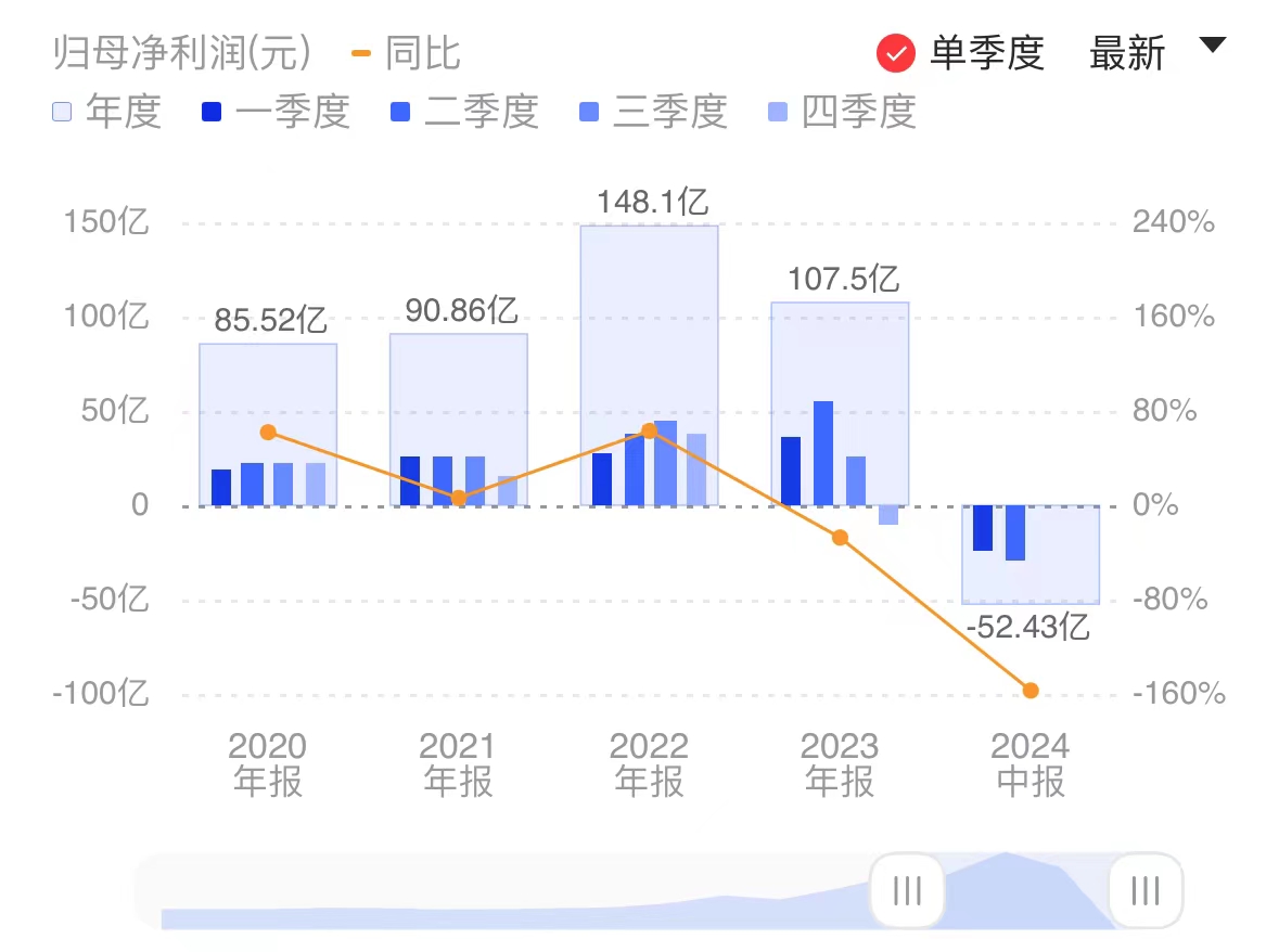 财联社8月30日电,隆基绿能披露半年报,2024年上半年实现营业收入385.29亿元,同比下降40.41%;净利润亏损52.43亿元,同比转亏,上年同期净利润91.78亿元。受产业链价格持续大幅下降和存货减值计提影响,报告期内净利润转亏。小财注:Q1净亏损23.50亿元,据此计算,Q2净亏损28.93亿元。