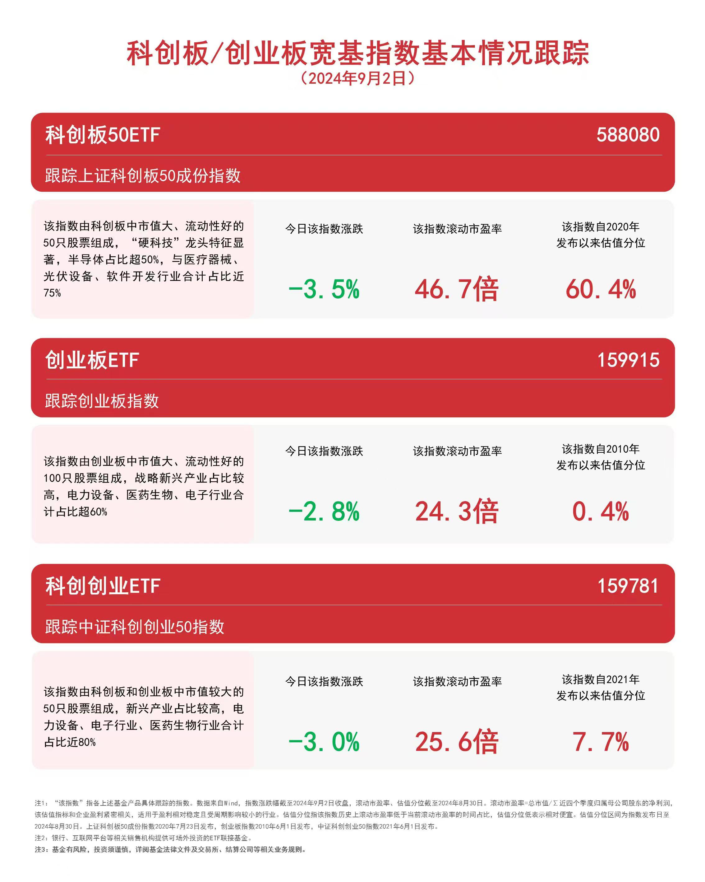 财联社9月2日电,截至收盘,今日创业板指数下跌2.8%,中证科创创业50指数下跌3.0%,上证科创板50成份指数下跌3.5%。