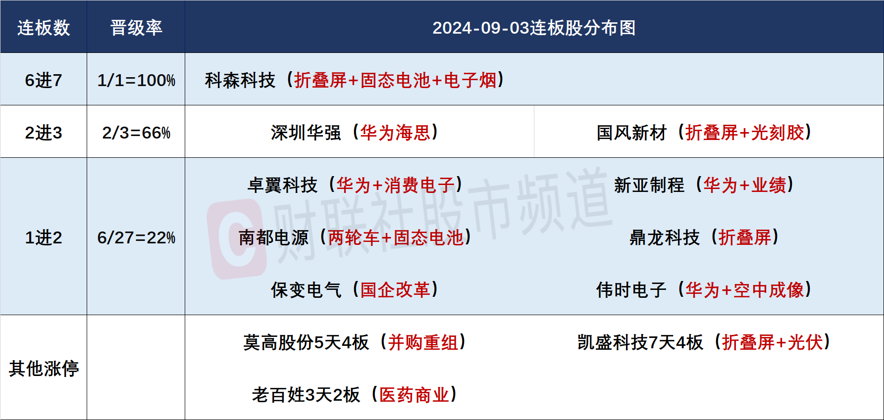 今日共42股涨停,连板股总数9只,其中三连板及以上个股3只,上一交易日共5只连板股,连板股晋级率60%(不含ST股、退市股及未开板新股)。个股方面,全市场超3900只个股上涨,短线资金继续抱团高位股为主,深圳华强午后再度涨停录得14天13板,科森科技承接良好放量T字板晋级7连板。后排个股依旧表现不佳,宝馨科技上演准“天地板”,日久光电、奋达科技跌停。板块方面,银行板块全天领跌,农业银行跌超4%,工商银行跌超3%;电子烟概念股集体爆发,东峰集团、顺灏股份等个股涨停,消息面上国务院烟草专卖行政主管部门建立全国统一的电子烟交易管理平台;华为新品发布会将于9月10日正式召开,华为概念股持续活跃,新亚制程、卓翼科技2连板。