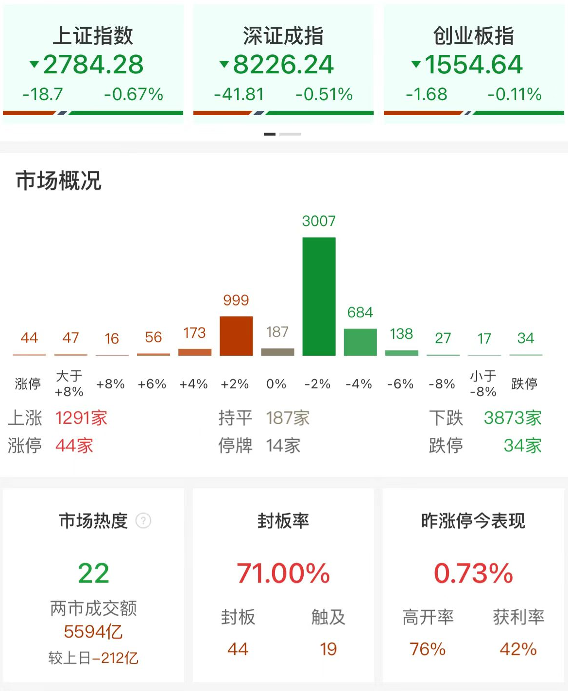 财联社9月4日电,市场全天震荡调整,沪指失守2800点再创阶段新低,创业板指相对偏强。盘面上,固态电池概念股再度大涨,德尔股份、丰元股份、东峰集团、华丰股份涨停。医药商业概念股延续反弹,漱玉平民、人民同泰、老百姓、健之佳涨停。光刻胶概念股一度冲高,华懋科技涨停。教育股逆势活跃,中国高科涨停。高位股维持强势,深圳华强15天14板,科森科技8连板。下跌方面,消费电子概念股展开调整,金龙机电跌近10%;ST股集体大跌,*ST景峰上演“天地板”。总体上个股跌多涨少,全市场近3900只个股下跌。沪深两市今日成交额5594亿,较上个交易日缩量212亿。板块方面,医药商业、固态电池、保险、教育等板块涨幅居前,ST板块、油气、消费电子、有色金属等板块跌幅居前。截至收盘,沪指跌0.67%,深成指跌0.51%,创业板指跌0.11%。