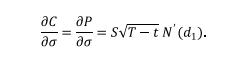 期权的Vega指隐含波动率每变动1个百分点时期权理论价值的变化。具有正Vega的期权,其价值会随隐含波动率升高而升高,反之则期权价值随隐含波动率升高而下降。香草期权的Vega公式为: