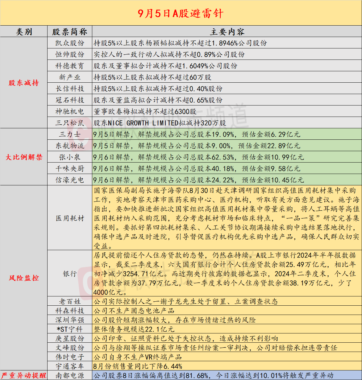 昨日公告的A股拟减持的公司数量较之前有所增多,凯众股份持股5%以上股东杨颖韬拟减持不超过1.8946%公司股份;张小泉、千味央厨将迎来超四成以上解禁;富时罗素调整富时中国50指数成分股,删除中国中免及金龙鱼;4天3板老百姓实际控制人之一谢子龙先生处于留置、立案调查状态;国家医保局加快推进新批次高值医用耗材集中带量采购,将人工耳蜗等纳入采购范围;8连板科森科技公告,公司不生产固态电池产品;美股三大指数收盘涨跌不一,大型科技股多数下跌。