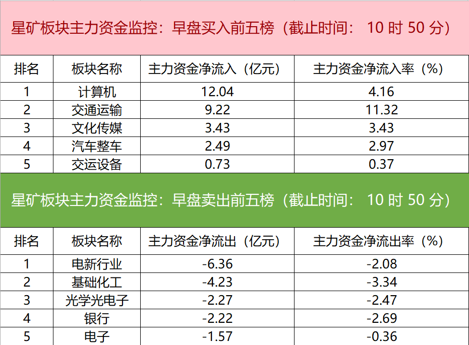 财联社9月5日电,财联社星矿数据显示,今日早盘主力资金净流入计算机、交通运输、文化传媒等板块,净流出电新行业、基础化工、光学光电子等板块,其中计算机板块净流入超12亿元。个股方面,大众交通涨停,主力资金净买入9.52亿元位居首位,天源迪科、昆仑万维、比亚迪获主力资金净流入居前;南都电源遭净卖出超2亿元,德尔股份、保变电气、华懋科技主力资金净流出额居前。