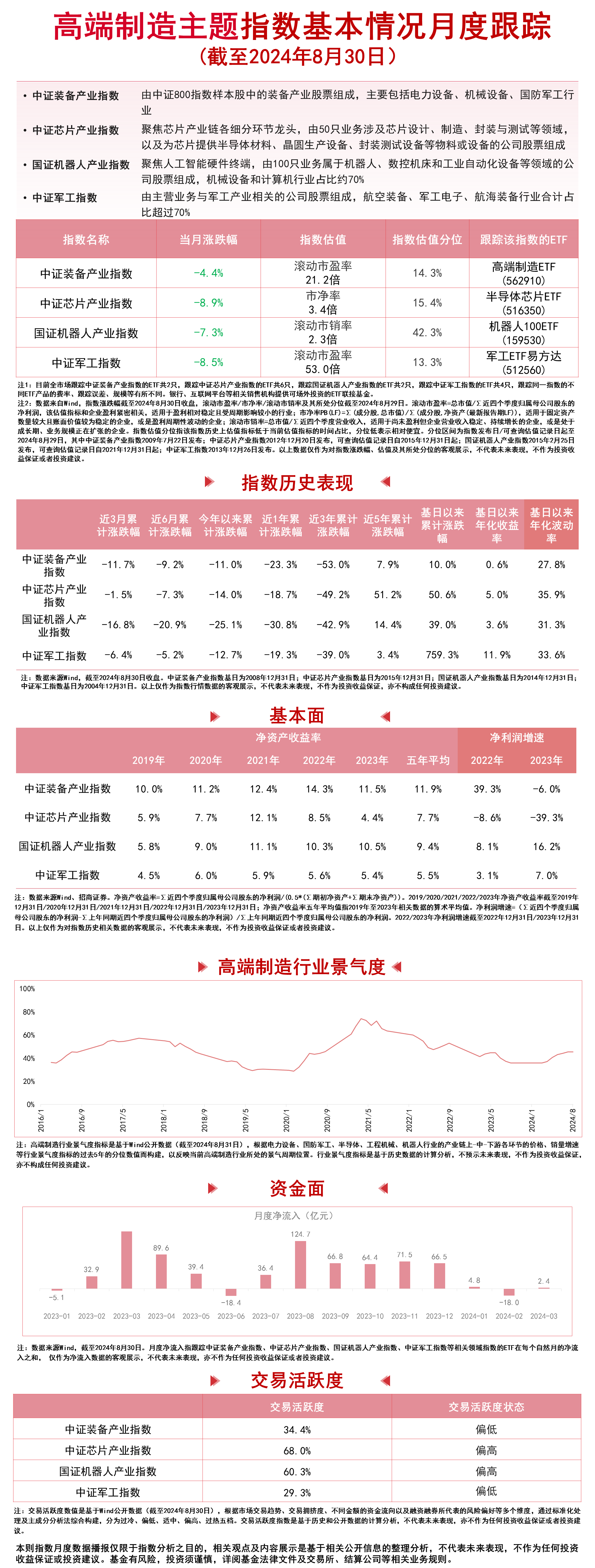 8月,中证装备产业指数下跌4.4%,中证芯片产业指数下跌8.9% ,国证机器人产业指数下跌7.3% ,中证军工指数下跌8.5%。