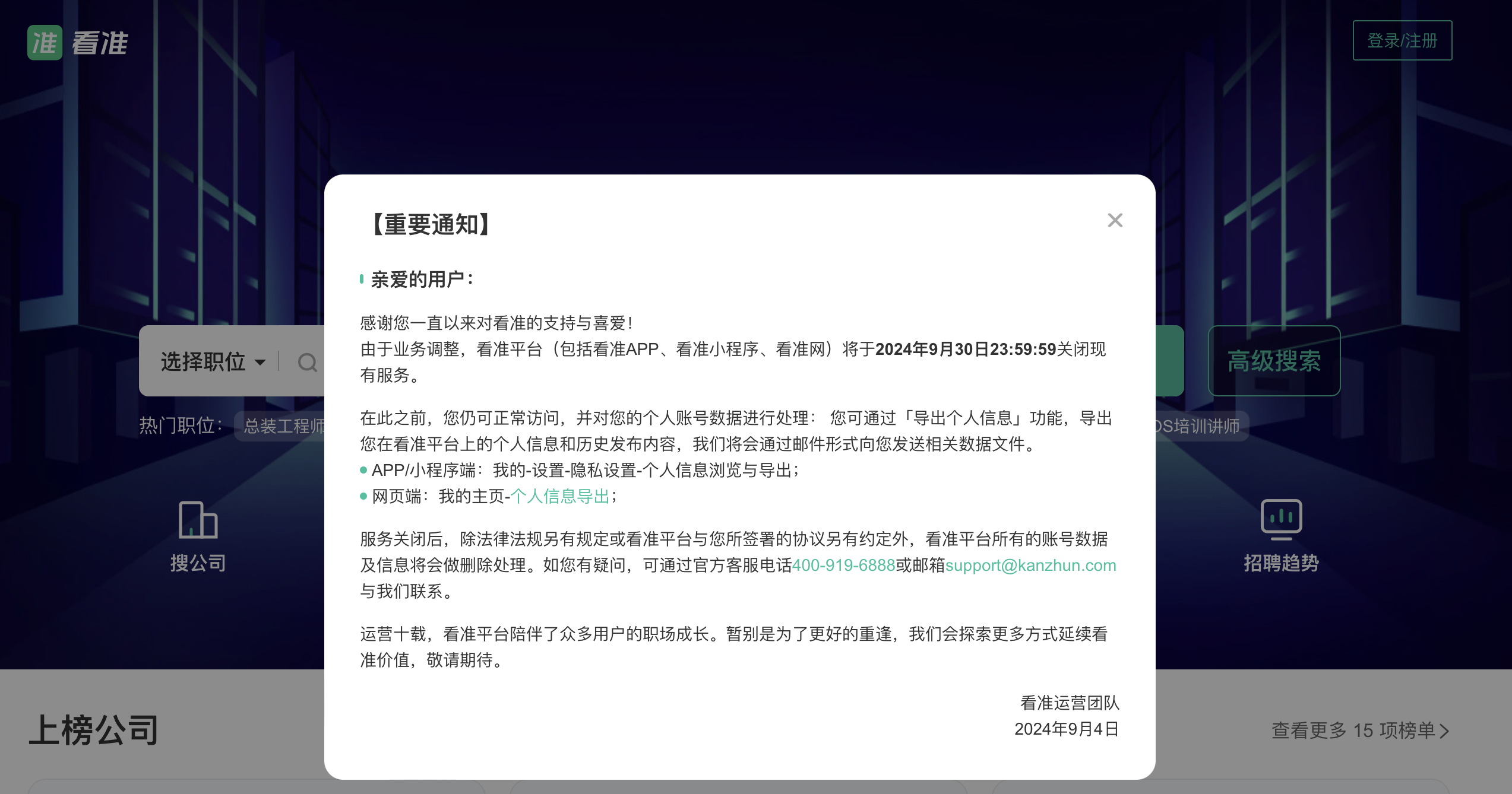 财联社9月5日电,看准运营团队发布通知:由于业务调整,看准平台(包括看准APP、看准小程序、看准网)将于2024年9月30日23:59:59关闭现有服务。服务关闭后,除法律法规另有规定或看准平台与您所签署的协议另有约定外,看准平台所有的账号数据及信息将会做删除处理。
