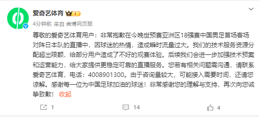 爱奇艺体育致歉:国足18强赛直播瞬时流量过大 后续加强运营能力
