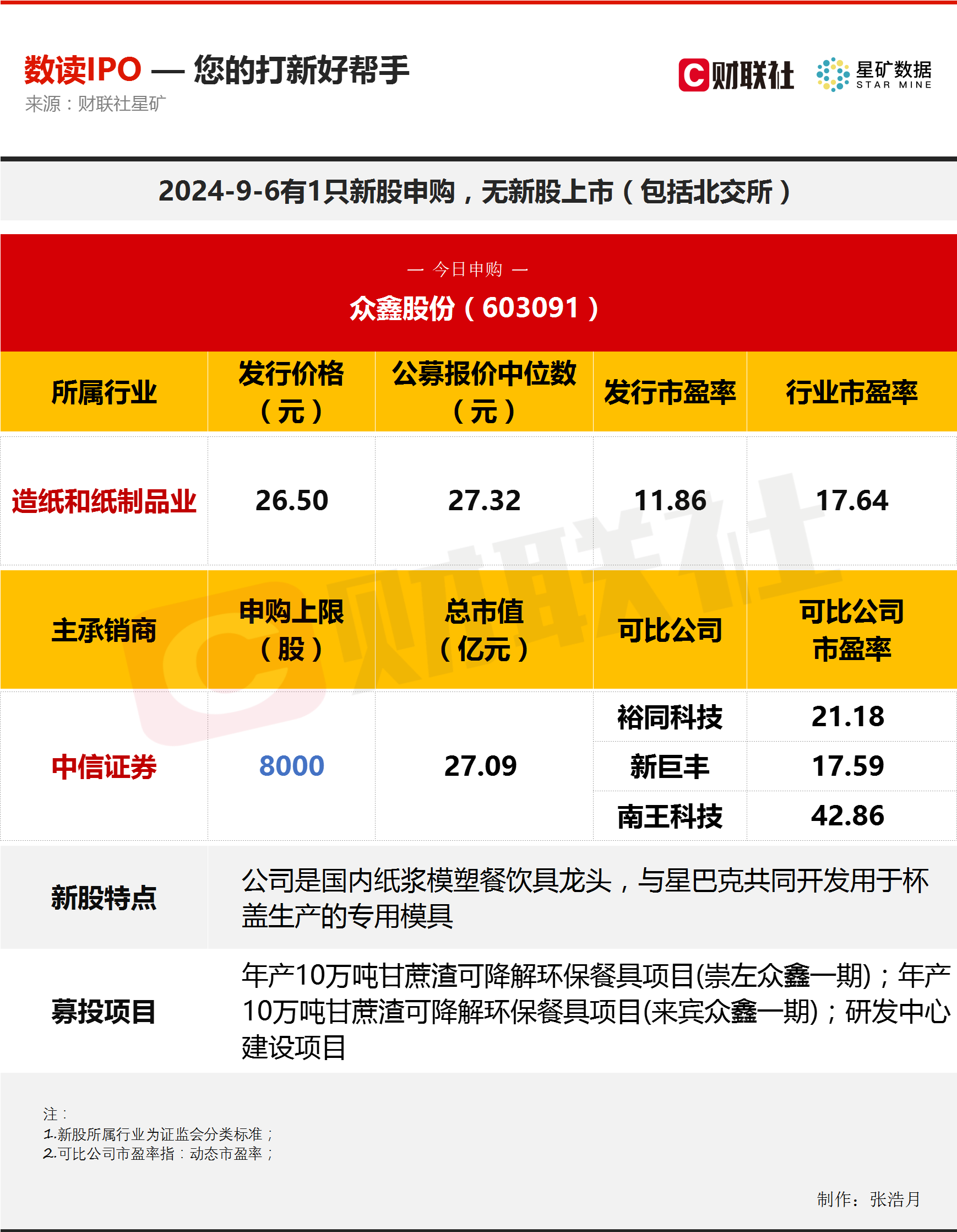 财联社9月6日电,今日有1只新股申购,为沪市主板的众鑫股份;无新股上市。众鑫股份是国内纸浆模塑餐饮具龙头。