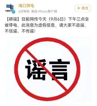 财联社9月6日电,据海口发布从海南电网海口供电局了解到,网传的“接到电力系统通知,下午3点左右全岛进入停电应急状态,随时可能没有电。”此消息为虚假信息,请大家不造谣、不信谣、不传谣!