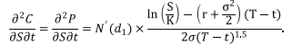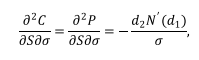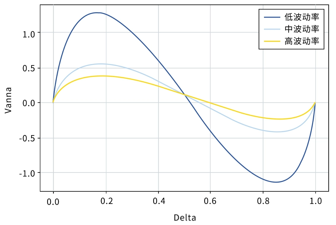 Vanna代表Delta值随波动率变化的敏感度,而Charm代表Delta值对时间推移的敏感度。由于波动率和到期时间对于期权Delta的影响类似,所以Vanna和Charm具有相似的性质。香草期权的Vanna公式为: