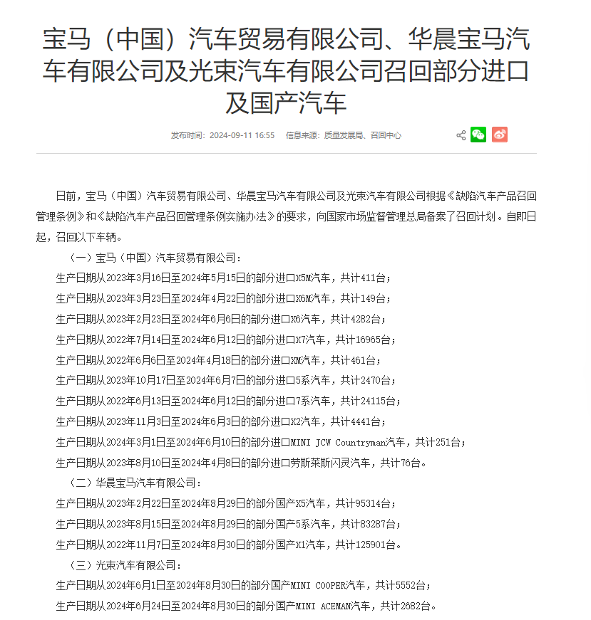 财联社9月11日电,宝马(中国)汽车贸易有限公司、华晨宝马汽车有限公司及光束汽车有限公司召回部分进口及国产汽车。