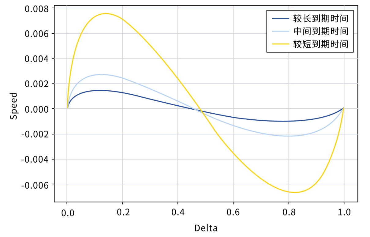 对看涨香草期权而言,Gamma在平值、深度实值和深度虚值时对于标的价格变动最不敏感,此时Speed值接近于0。此外,如果剩余到期时间减少或者波动率降低,会导致Speed的上升;反之会导致Speed的下降。